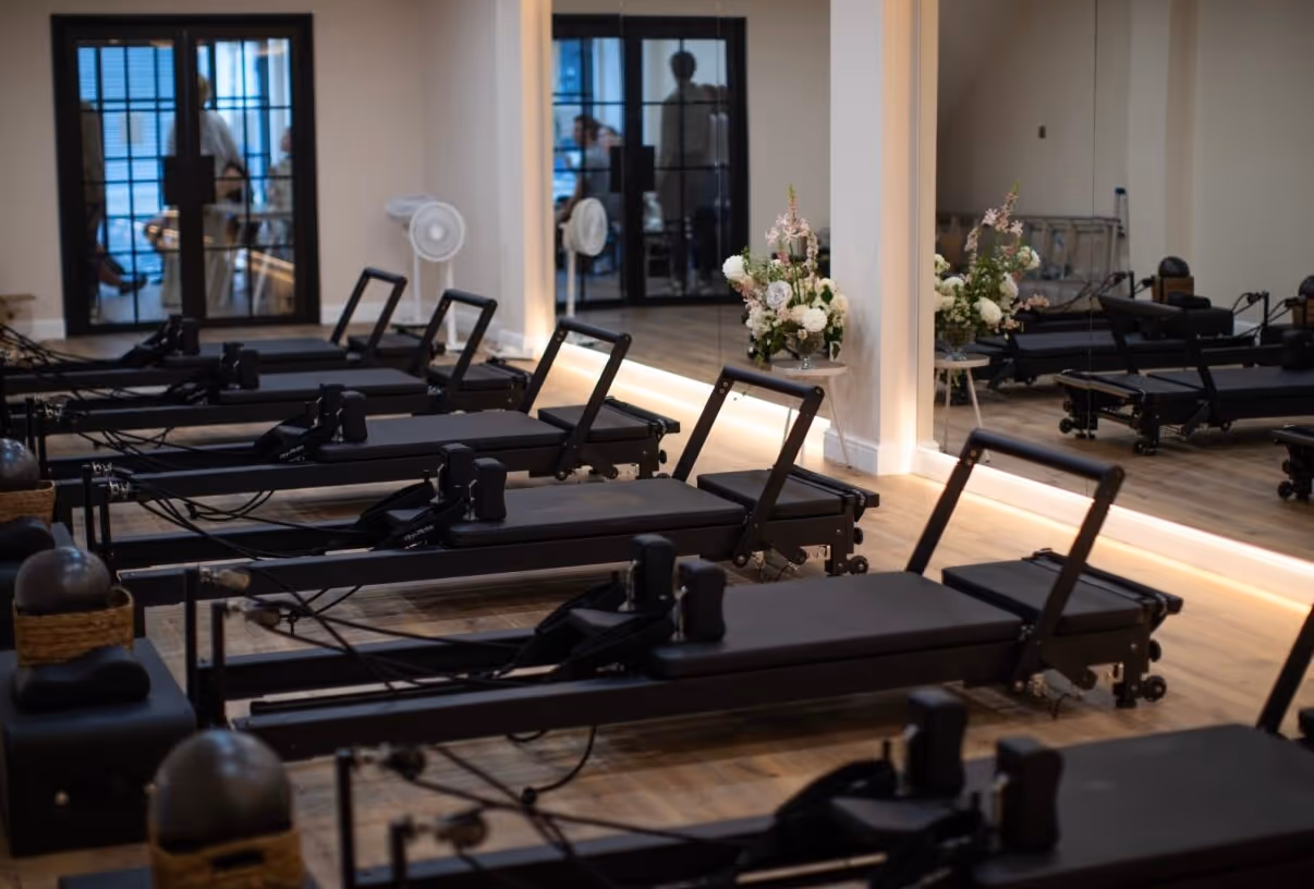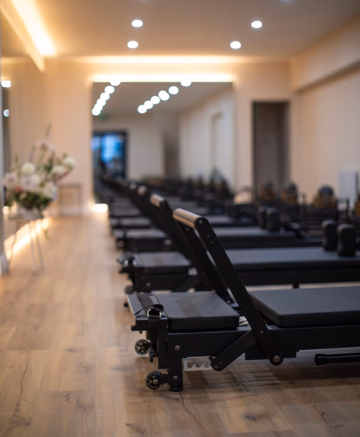 Our studio features seven carefully arranged Reformer beds, creating a warm and inviting environment for your Pilates practice. Towards the front of the studio, our cosy waiting area invites you to unwind before and after class . A perfect place to catch up with fellow members and savour delicious smoothies, matcha, coffees, and more, all lovingly crafted by local producers.